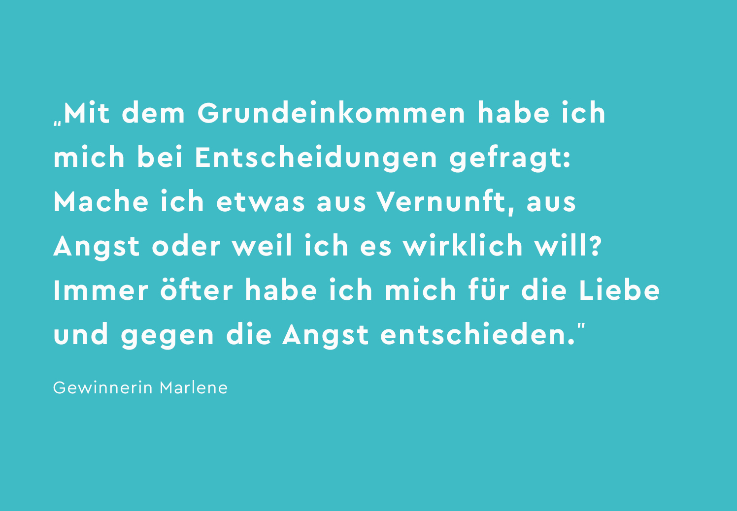 Allen ist klar, dass 1.000 € zu wenig sind, um den Lebensunterhalt komplett zu bestrei­ten und die Dauer von 12 Monaten erstmal nur zum Ausprobieren taugt. Auch erhebt niemand den Anspruch, dass dieser Ausschnitt an Personen repräsentativ für ein ganzes Land ist. Doch was als ein gesellschaftliches Experiment auf Zeit gestartet wurde, entpuppt sich auch zur Überraschung der Initiatoren als etwas ganz anderes als erwartet: