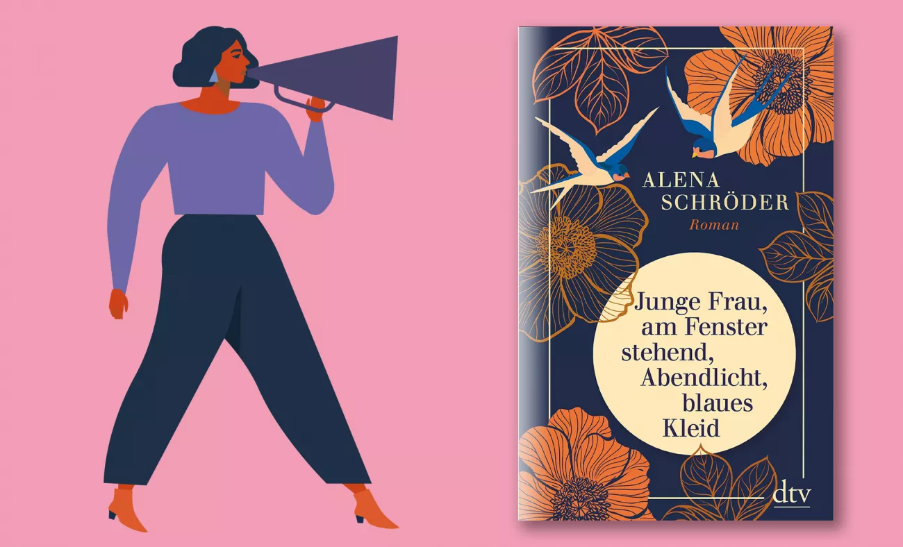 Ein spannender Unterhaltungsroman über starke Frauen und familiären Zusammenhalt ist Junge Frau am Fenster stehend, Abendlicht, blaues Kleid von der Journalistin und Kolumnistin Alena Schröder, inspiriert von der eigenen Familiengeschichte.