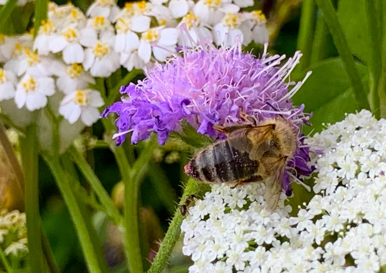 Oder ich schnappe mir einen Gartenstuhl und setze mich zum „Bee-Watching“ mit einer Tasse Kaffee in eine der Blumenwiesen. Was da so passiert, ist einfach unglaublich spannend. Denn die Meinung vieler Menschen, dass es nur eine Bienensorte gibt, ist natürlich leicht untertrieben. Alleine schon beim Beobachten wird klar, dass die Familie der Bestäuber sehr groß ist. Es gibt, ganz auffällig natürlich, die dicken Hummeln, aber auch bei den Bienen gibt es eine große Vielzahl. Braune und Schwarze, Große und Kleine, welche mit gelben und schwarzen Streifen und andere, die ein rotes Hinterteil haben.